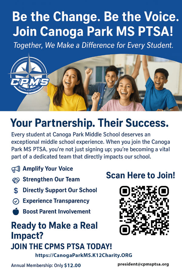 By joining the Canoga Park MS PTSA, you are doing more than just paying a fee; you are making a powerful investment in teamwork, student success, and the future of our school. You are joining the only official group dedicated to championing parent involvement and driving direct school support.